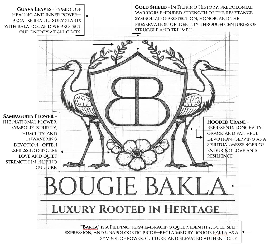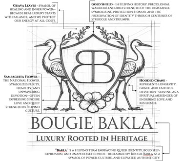 Not just a logo—It’s a whole identity. Every detail behind BOUGIE BAKLA is rooted in Filipino culture, history, and pride. From the symbolism woven into each element to the deeper nods to where we come from, this is about honoring our ancestors of the islands, while showing up proud, with intention, and a little sassy.
